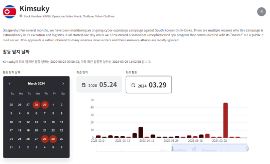 특정 해킹 그룹의 주된 공격 활동 요약 설명과 탐지된 활동 날짜 및 최근 활동 트렌드를 확인할 수 있습니다.
