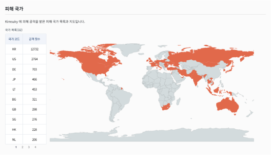 해킹 그룹에 의해 공격을 받은 피해 국가 목록과 지도를 제공합니다.