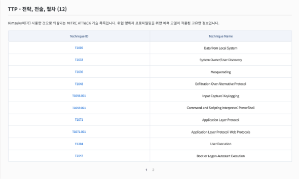 해킹 그룹이 사용한 것으로 의심되는 MITRE ATT&CK 기술 목록이 제공됩니다.